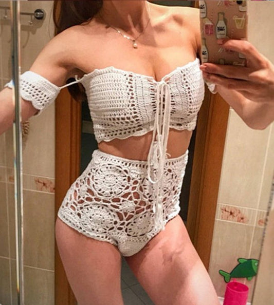 Hollow Knitted Beach Skirt Bikini Swimsuit